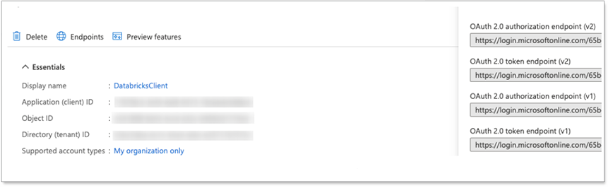 After you register your application, make a note of the Application (client) ID in the Essentials section of the app’s overview page. Also, make a note of the OAuth 2.0 authorization and token endpoints. These are required later when configuring the Databricks connection in ThoughtSpot.