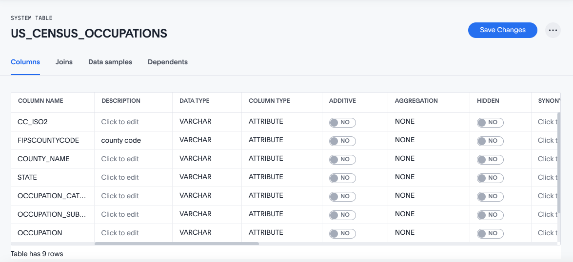 To make modeling settings for a data source you’ve just loaded, or to make a quick change to existing settings, use the ThoughtSpot web interface. You can adjust the Columns settings from the data management listing.