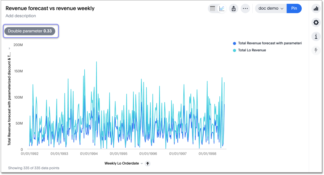 When you create or view a Liveboard that contains a formula with a parameter, you’ll know: ThoughtSpot displays the name of the parameter and its current value below the Liveboard description, in the row where it displays filters.