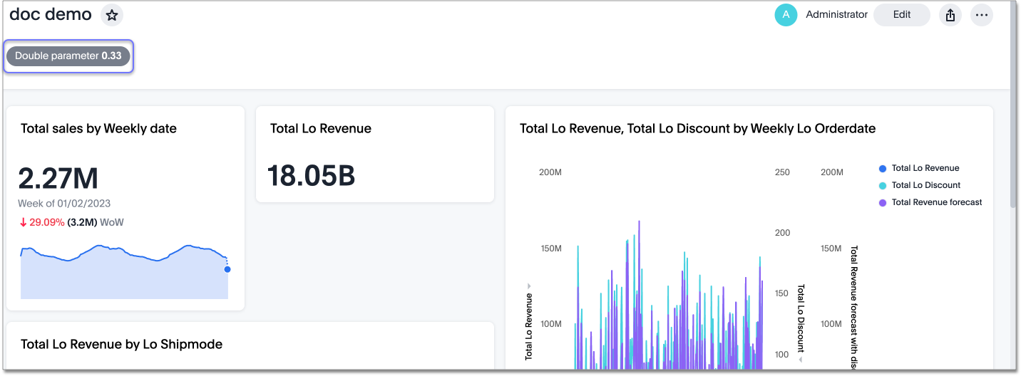 When you create or view an Answer that contains a formula with a parameter, you’ll know: ThoughtSpot displays the name of the parameter and its current value below the Answer description, in the row where it displays filters.