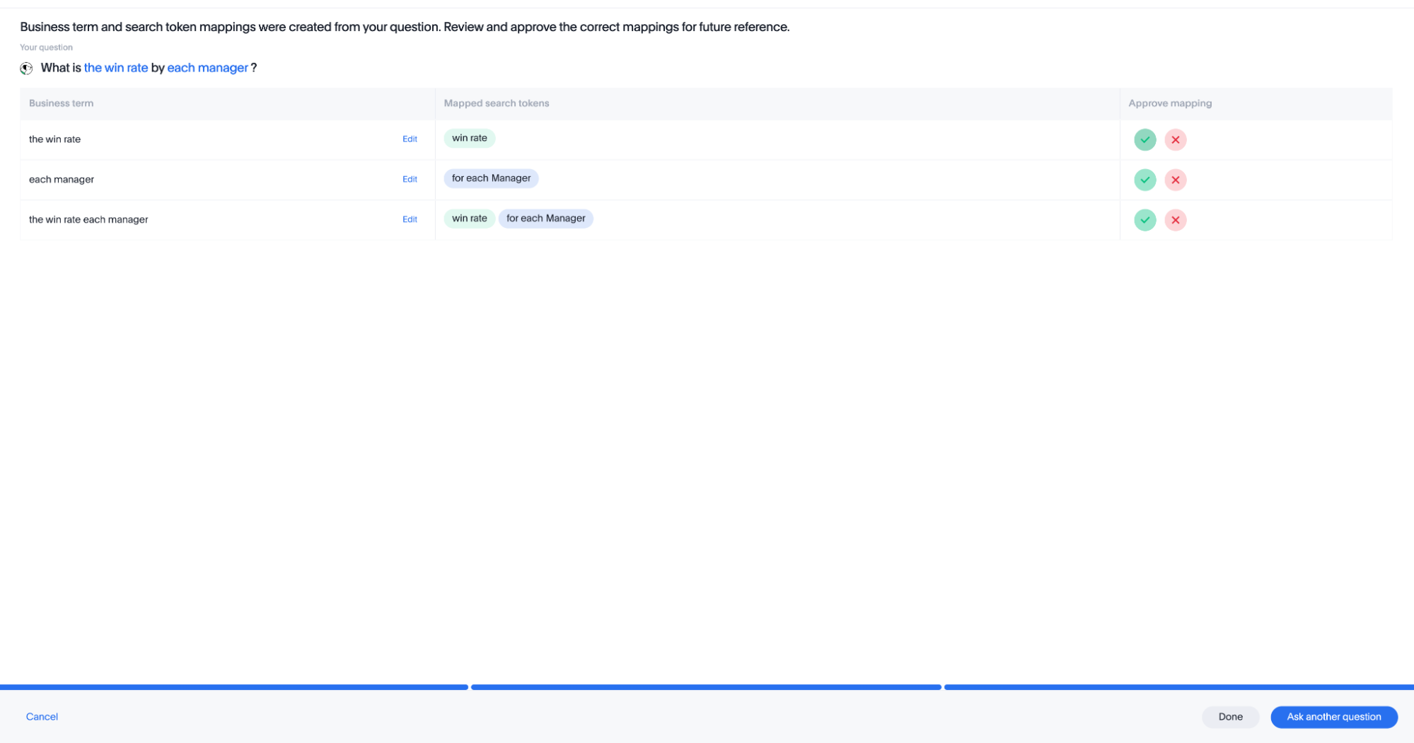 • Once you have coached for a business term, try asking a few other questions in your list to evaluate whether the system is able to apply the learnings.