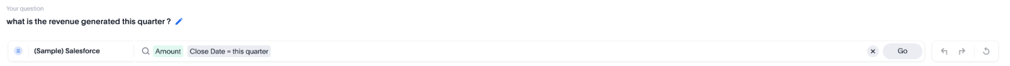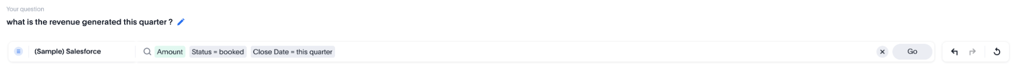 Once you have entered the question, press Next. Once you press Next, we generate the answer for this question. The answer generated by AI looks reasonable, but in order for an amount to qualify as revenue, we have to apply a filter on “Status = booked”.