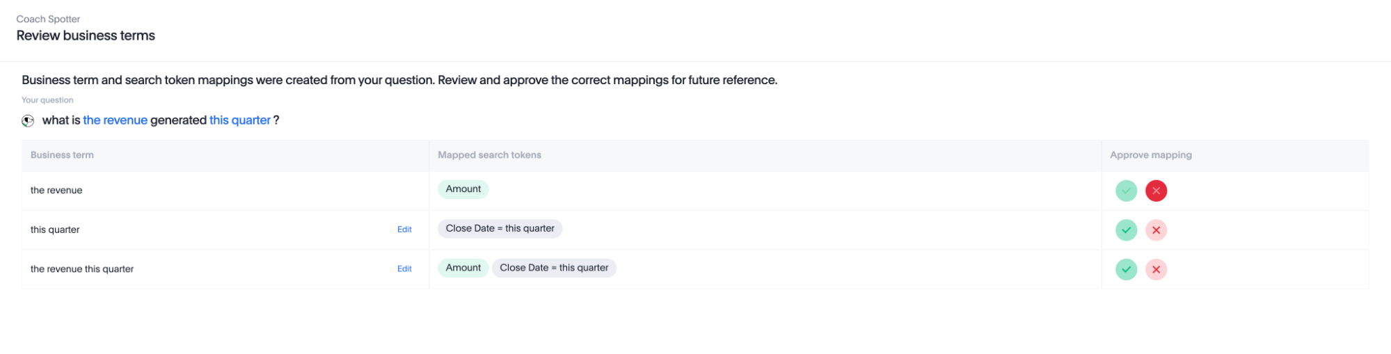 Once you have identified the list of questions, you can use the guidelines listed above for reference questions and business terms to identify the key business terms and reference questions you should add. Conducting this analysis will help you answer questions like, what coaching should I provide to Spotter, and how much coaching is needed for my use case.