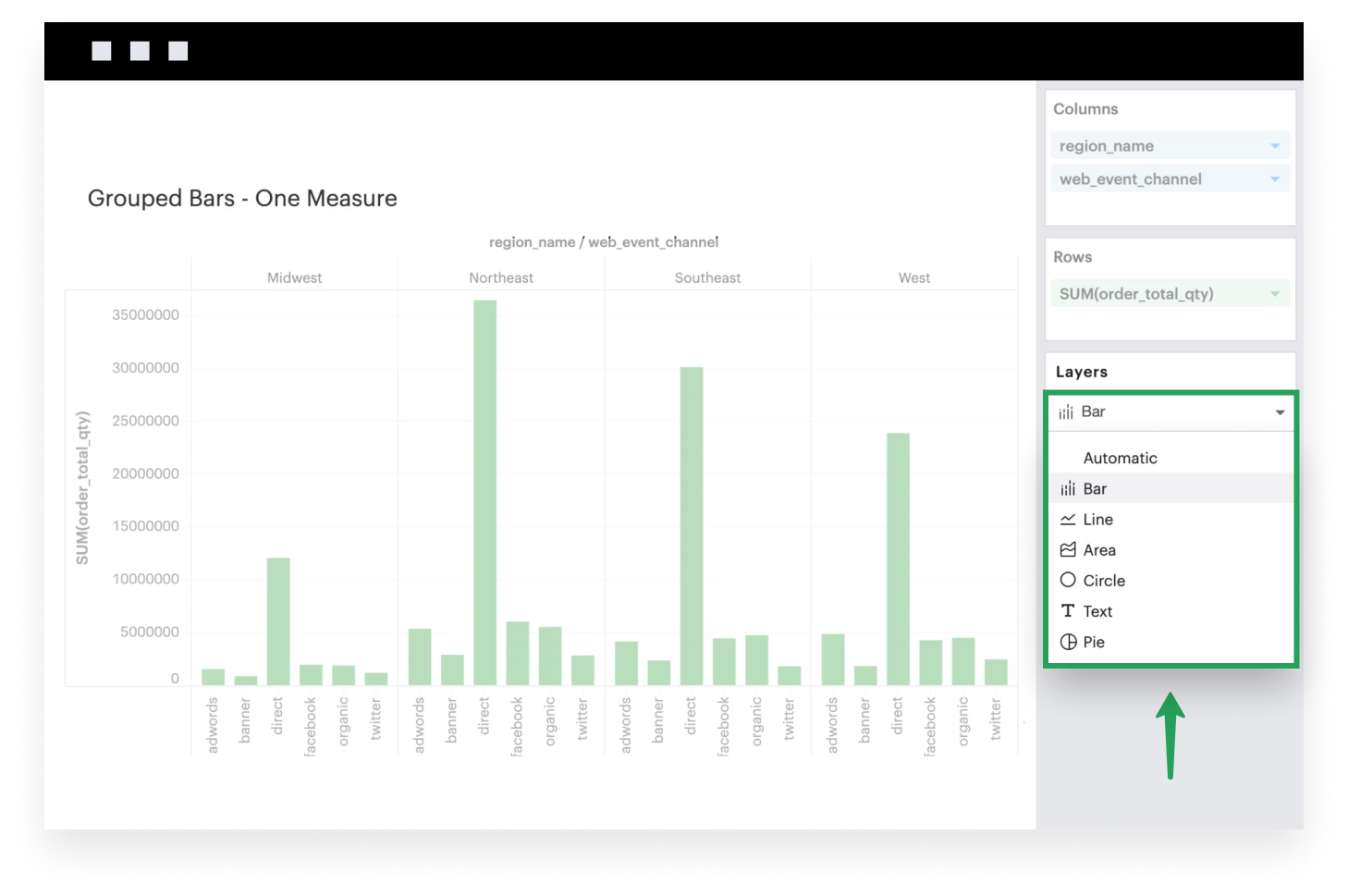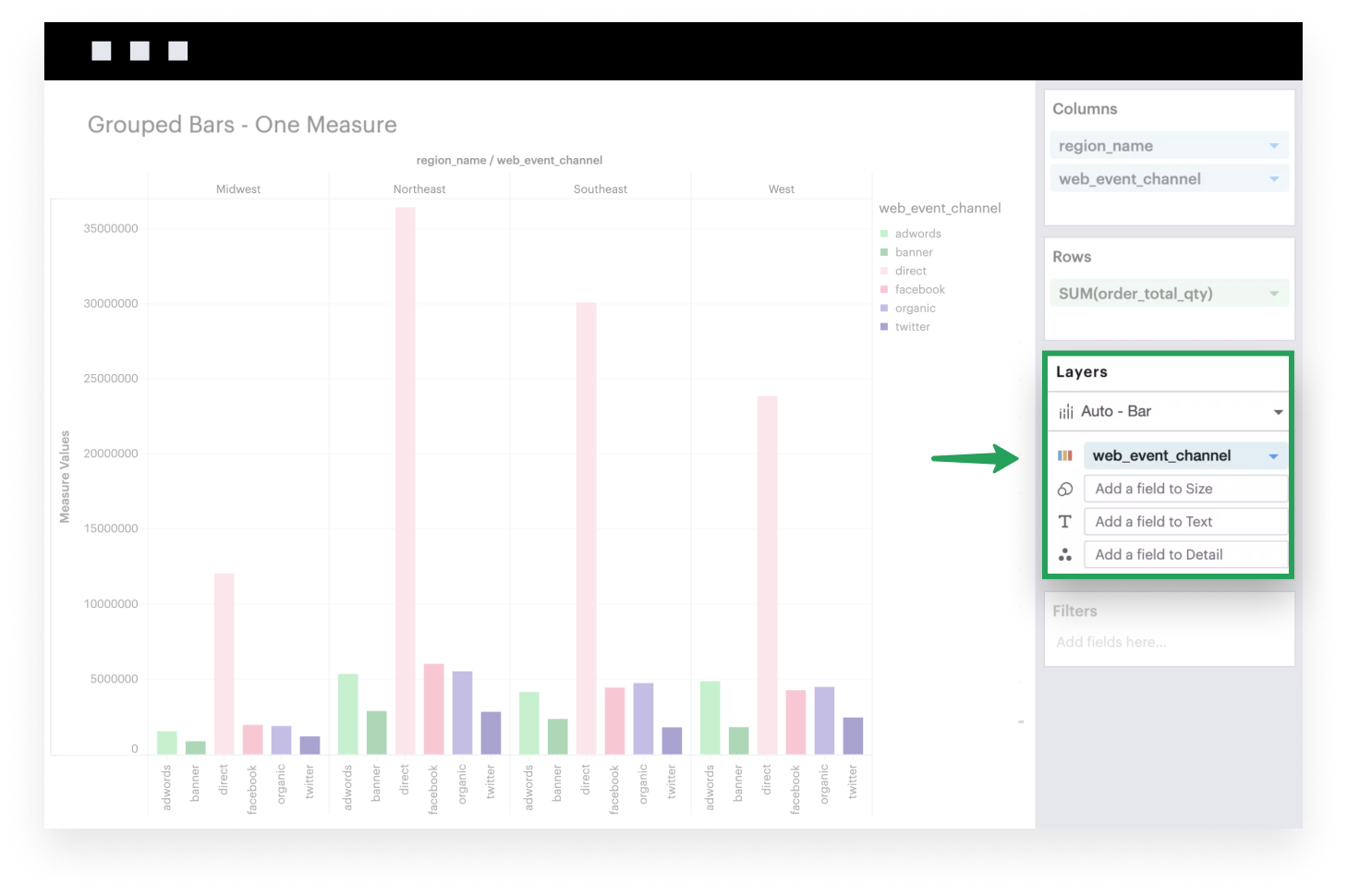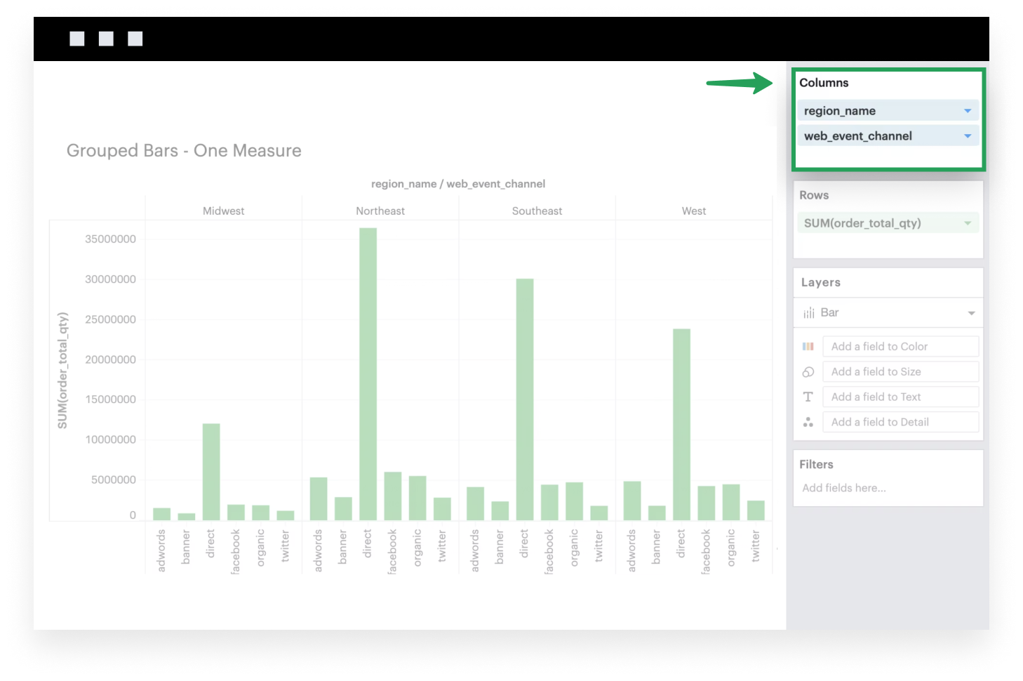 This example will walk you through how to create a simple grouped bar chart with one continuous field that’s broken into groups based on some dimension.