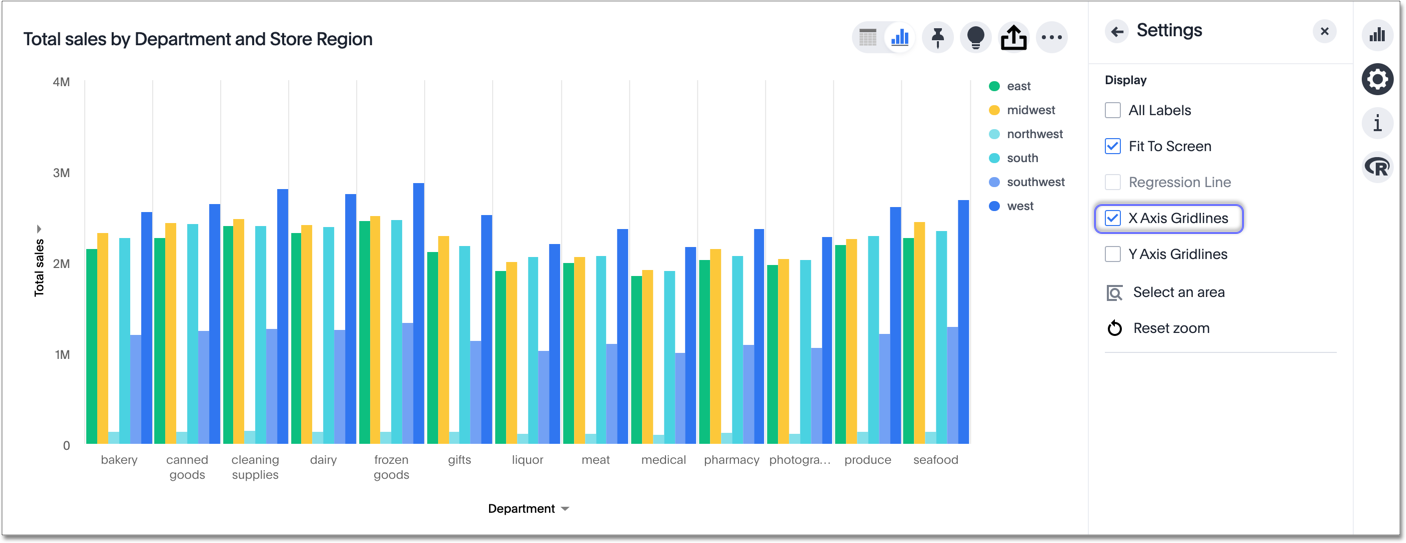 X-axis gridlines are useful when you have a more complicated chart. For example, if you view a column chart for sales by department and store region, you might want to use gridlines to more easily visualize the column groups. You might also use gridlines when your chart includes a time element.