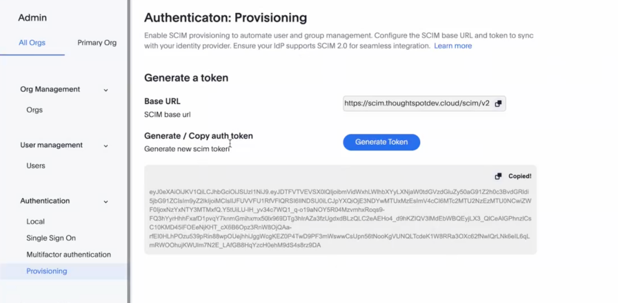 Click Generate Token to generate and copy the authentication toke. This token is used to authenticate the SCIM service (ThoughtSpot application) in your IdP.
