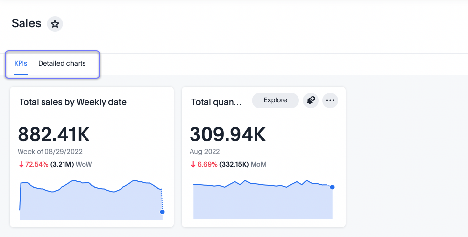 You may want to separate your Liveboard into multiple tabs, grouping certain visualizations together in each tab. For example, you may have a Sales Liveboard that contains top-level KPIs and more detailed charts. You can create a tab for the top-level KPIs for executives to view, and a tab for the more detailed charts that managers need to monitor. To add tabs, select the Edit button at the upper right of the Liveboard, and select + Add tab in the top menu.