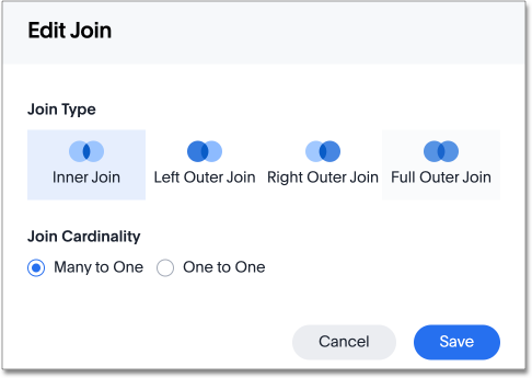 in the top right corner, scroll to the Cardinality section of the Edit join pop-up, and click the desired cardinality. Click Save, review the changes that will be made to the join’s dependents, and click Save again.